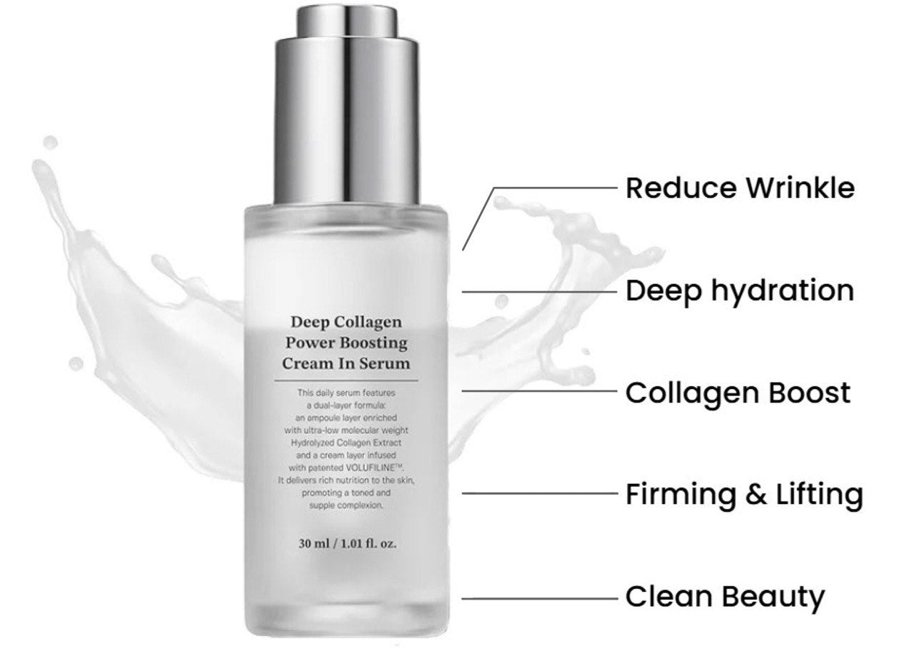 The Deep Collagen Power Boosting Cream-in-Serum blends advanced skincare science with refined simplicity. Formulated with low-molecular collagen and Volufiline™, it penetrates deeply to firm, plump, and smooth the skin from within. Enriched with 17 amino acids, niacinamide, and hyaluronic acid, it strengthens the skin barrier, improves elasticity, and delivers lasting hydration. Lightweight yet nourishing, it leaves the complexion visibly lifted, radiant, and supple — the essence of effortless luxury skincare.